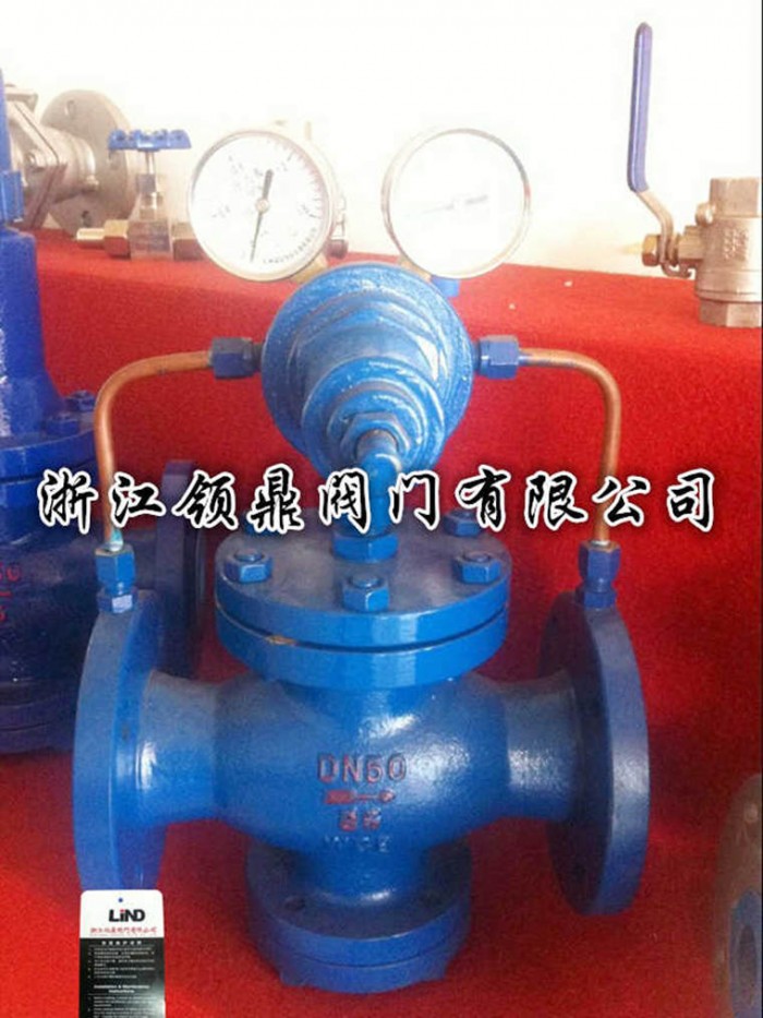 YK43F先导活塞式气体减压阀 氢气减压阀由主阀和导阀两部分组成。主阀主要由阀座、主阀盘、活塞、弹簧等零件组成。导阀主要由阀座、阀瓣、膜片、弹簧、调节弹簧等零件组成。通过调节调节弹簧压力设定出口压力、利用膜片传感出口压力变化,通过导阀启闭驱动活塞调节主阀节流部位过流面积的大小,实现减压稳压功能。