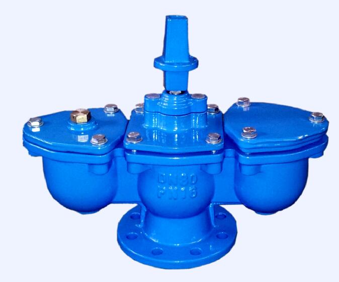 双口排气阀有大口,小口两腔,大口腔可大量排气,吸气,小口腔可在管路内满水的情况下小量排气吸气,其功能主要用来也止停泵时管路内产生负压,导致管路破坏。