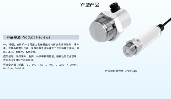 特性:油田矿井专用压力变送器是专为解决在油田钻井、深井中,泥浆易堵塞引压孔,强振动等恶劣环境下工作而特殊设计的,中温、高压、高精度、高稳定性。