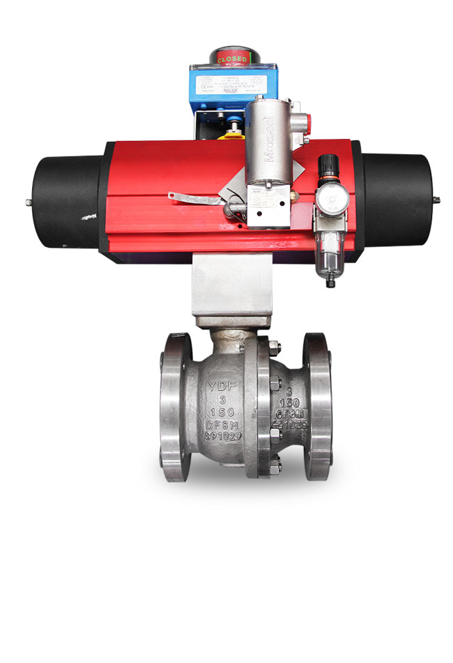 Q641PPL\H气动一体式球阀结构特点: 气动一体式球阀吸取国外高温球阀结构特点,结合国内实际情况研制而成。一体式球阀的密封圈具有高强度、高耐磨、回弹性强等优点,密封可靠,使用寿命长,被广泛用于石油、化工等蒸汽管道。Q641PPL\H气动一体式球阀主要技术参数与性能 :公称压力 1.6/2.5/4.0/6.4Mpa使用温度范围 -20-250℃ (PPL) -20-425℃(H)公称通径 DN15-200mm阀体材质 WCB .304. 316.316L. 连接方式 法兰适用介质 水.油.天然气.及酸.碱等腐蚀性流体作用方式 切断型.调节型驱动方式 双作用. 单作用 (弹簧复位)气源压力 (0.4-0.7)Mpa Q641PPL\H气动一体式球阀配套附件 :①电磁阀(DC24V、AC220V)(防爆、普通); ②空气减压过滤器(三联件); ③限位开关(防爆、普通); ④手动机构; ⑤电气定位器(4-20MA)气动阀门定位器(0.15-0.8)Mpa; ⑥可提供各类进口附件