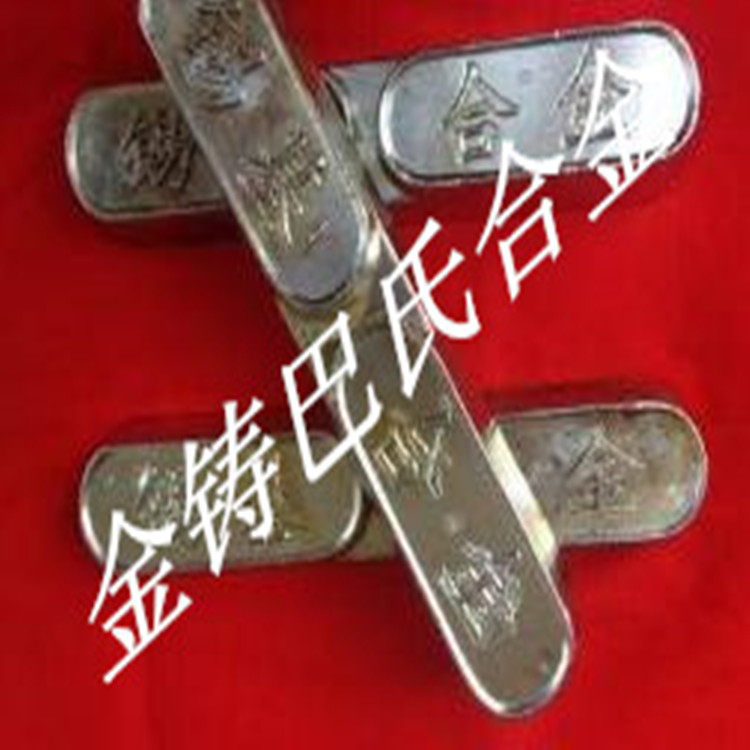 巴氏合金执行标准:GB/T 1174-1992《铸造轴承合金》(GB 8740-1988的标准)Q/HY.100.001.1《轴承合金企业标准》巴氏合金的主要成分是锡、铅、锑、铜、。其中锑和铜,升合金强度和硬度,为细化颗粒、增加硬度,不同型号增加不同微量的镍、银、镉、钙、等稀有金属。巴氏合金可简单地分为三种:高锡合金、高铅合金和中间合金(合金中锡和铅均占有重要比例)。在所有这些巴氏合金中,锑和铜均作为重要的合金化元素和硬化元素,而且其结构是由硬的、弥散于软基质中的金属间化合物组成。
