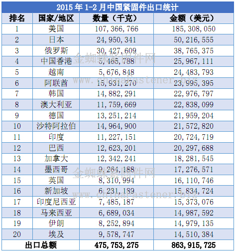 海关数据显示,2016年1-11月,中国出口紧固件250.30万吨...