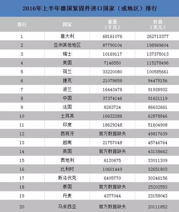 2016上半年德国紧固件进出口总额近50亿美元