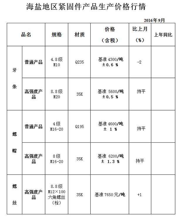 2016年9月海盐地区紧固件产品生产价格行情表注:抽样产品价格...