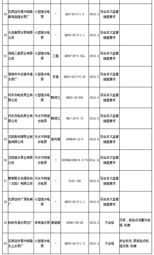 辽宁省质监抽检40批次潜水泵 1批次不合格