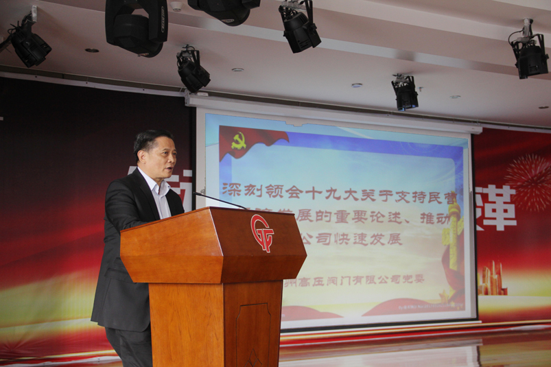 公司党委书记、董事长陈清流主持并做了重要讲话,他提出全公司要迅速掀起学习宣传贯彻党的十九大精神的热潮,统一思想、凝聚力量,确保党的十九大精神和***新时代中国特色社会主义思想在兰州高压阀门有限公司落地生根,形成生动实践。并对学习十九大精神提出四点具体要求:一是要精心制定学习计划、二是要强化学习培训、三是要深化宣传宣讲、四是要组织专题研讨。
