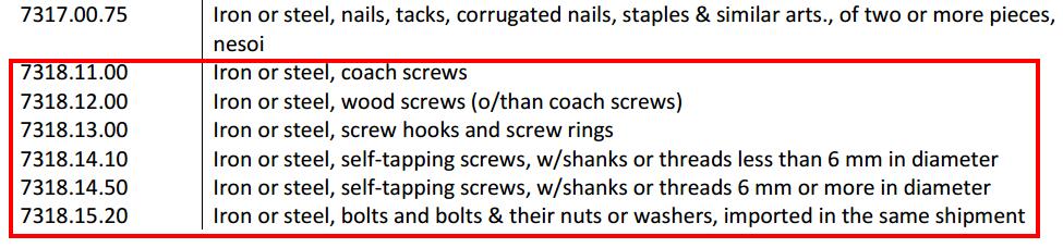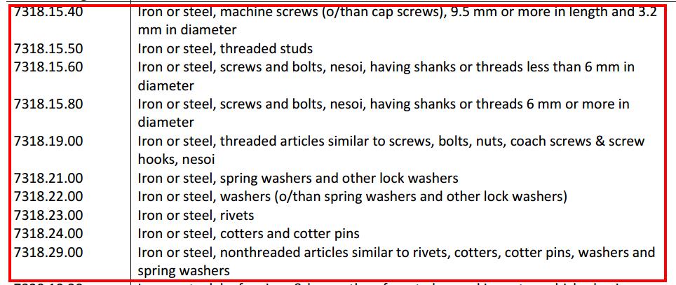 7318.15.80 螺钉和螺栓,杆部或螺纹直径≥6mm,钢制或铁制