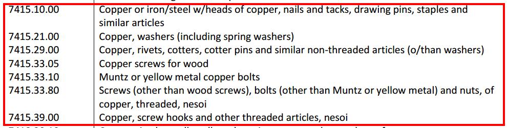 7415.39.00 铜制,螺丝钩以及其他带螺纹制品