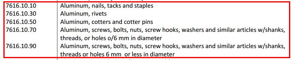 7616.10.70 铝制,螺钉,螺母,螺丝钩,垫圈及类似制品,带杆,螺纹或孔直径不包括6mm
