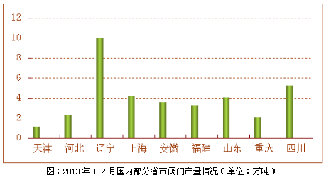 再就除以上三省外阀门生产量过万吨的地区市场进行分析,在生产量过万吨的九省(市)中,拥有9.97万吨阀门产量及2.54%同比增长率的辽宁省无疑成为继浙江、河南、江苏后的又一强劲地区;除此之外,四川、上海、山东三省(市)也享有一定的市场优势,这从5.25、4.14、4.07万吨的累计产量及39.49%、13.94%、11.2%的同比增幅中便可得知。