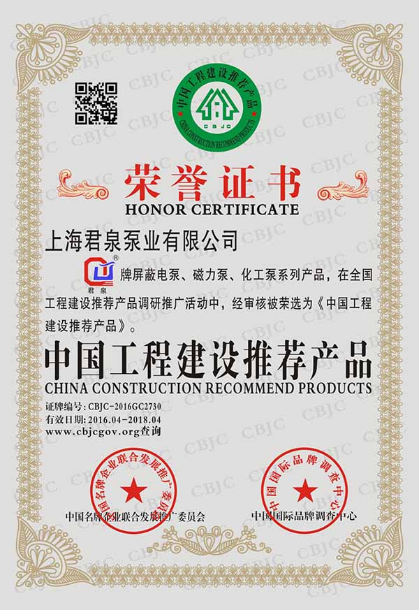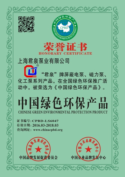 上海君泉泵业有限公司是一家集研发与生产为一体的制泵企业。公司已通过ISO9001:2008国际质量体系认证,并取得了《全国工业产品生产许可证》。公司长期与泵阀领域权威专家进行广泛交流和技术合作,现已拥有一支很强的科研团队并自主开发出多种高效率水泵系列,并荣获《全国质量诚信先进企业》、《中国科技创新优秀企业》、《全国质量信得过产品》、《中国工程建设推荐产品》、《全国质量检验稳定合格产品》、《中国绿色环保产品》等荣誉称号。同时由中国企业信用调查评价中心颁发的资信证书《资信等级AAA》企业。