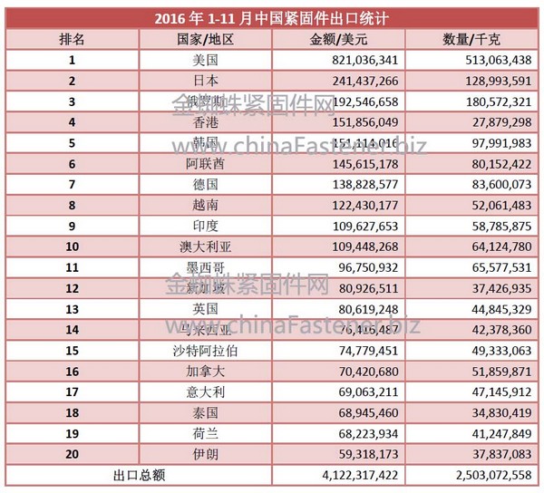 海关数据显示,2016年1-11月,中国出口紧固件250.30万吨,出口金额达41.22亿美元。其中出口金额占前五的市场分别是美国、日本、俄罗斯、香港、韩国。