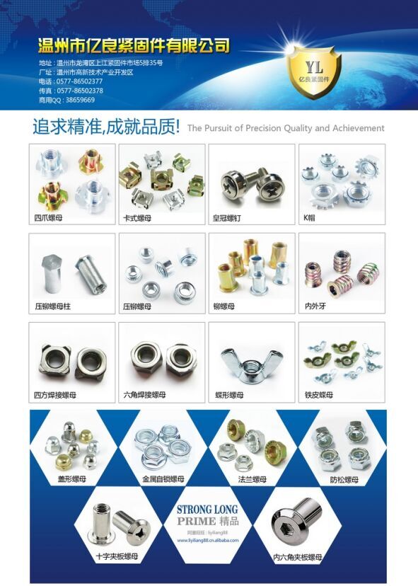 温州亿良紧固件有限公司,成立于2008年,一直专注于各类螺母的研发、生产与销售。作为专业的螺母制造商,该公司生产的螺母种类齐全,包括卡式螺母,K型螺母,四爪螺母,压铆螺母,铆螺母,尼龙盖母,四方焊接螺母,六角焊接螺母,皇冠螺钉,铁皮冲压蝶母,冷镦蝶形螺母,四方螺母,808灯饰细牙螺母,防松螺母,法兰螺母,盖型螺母,油管螺母,圆螺母,家具螺母,内外牙螺母,夹板螺母,GB806,GB807滚花薄螺母,膨胀螺母,高品质通止规六角小螺母,小防松螺母M1.2-M8;GB6183-6187自锁螺母,GB51-55,GB6170-6175,M3-M64;英美制螺母,球拍螺钉,蝶形螺钉,吊环螺钉,压铆螺母柱,压铆螺钉及定制非标件,不锈钢材质也备有现货。