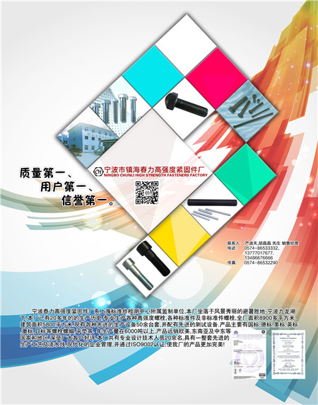 宁波市春力高强度紧固件厂系上海标准件检测中心所属监制单位,坐落于风景秀丽的避暑胜地宁波九龙湖下,发展至今已有20多年生产历史,专业生产各种高强度螺栓,各种标准件及非标螺栓。