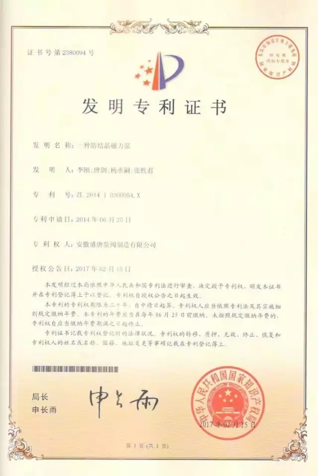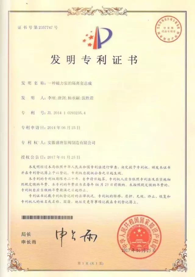 安徽盛唐泵阀制造有限公司自主研发的新产品:一种磁力泵的隔离套总成、一种防结晶磁力泵,荣获国家发明专利。一直以来,安徽盛唐泵阀制造有限公司研发人员都致力于产品功能性的研究,通过调整产品设计方案,进一步优化产品性能。