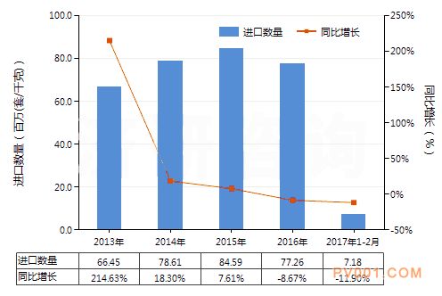 图 2013-2017年2月中国安全阀或溢流阀(用于管道、锅炉、罐、桶或类似品的)(HS84814000)进口量及增速统计