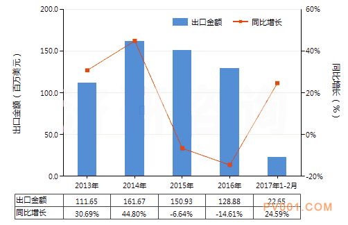 2017年1-2月我国安全阀或溢流阀(用于管道、锅炉、罐、桶或类似品的)出口金额为22.65百万美元,与上年同期相比增长了24.59%。2016年我国安全阀或溢流阀(用于管道、锅炉、罐、桶或类似品的)出口金额为128.88百万美元,与上年同期相比下降了14.61%。详见下图: