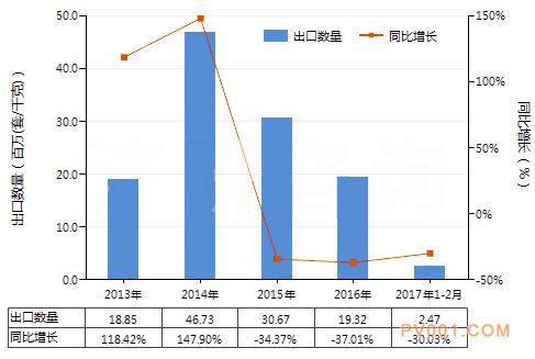 图 2013-2017年2月中国安全阀或溢流阀(用于管道、锅炉、罐、桶或类似品的)(HS84814000)出口量及增速统计