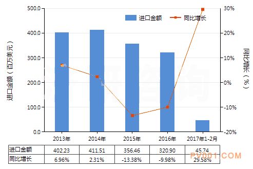 图 2013-2017年2月中国安全阀或溢流阀(用于管道、锅炉、罐、桶或类似品的)(HS84814000)进口总额及增速统计