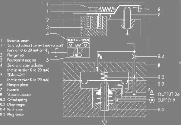 那么在电/气阀门定位器中输入的电信号是如何转换成气信号的呢?我们以SAMSON 6111 型电/气转换器为例介绍一下它的工作原理(见图1):