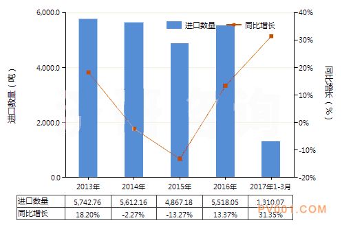图 2013-2017年3月中国龙头,旋塞及类似装置的零件(用于管道、锅炉、罐、桶或类似品的)(HS84819090)进口量及增速统计