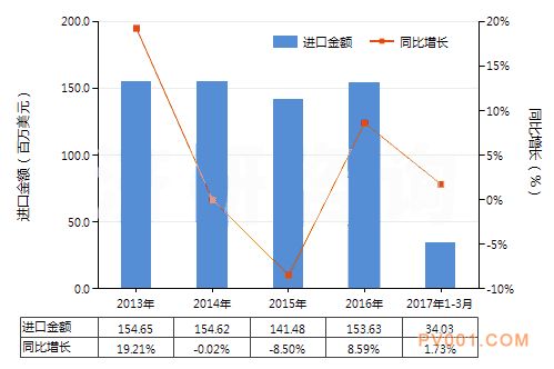 从进口额方面来看,济研咨询数据显示,2017年1-3月我国龙头,旋塞及类似装置的零件(用于管道、锅炉、罐、桶或类似品的)进口金额为34.03百万美元,与上年同期相比增长了1.73%。2016年我国龙头,旋塞及类似装置的零件(用于管道、锅炉、罐、桶或类似品的)进口金额为153.63百万美元,与上年同期相比增长了8.59%。详见下图: