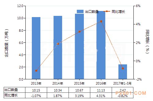 图 2013-2017年3月中国龙头,旋塞及类似装置的零件(用于管道、锅炉、罐、桶或类似品的)(HS84819090)出口量及增速统计