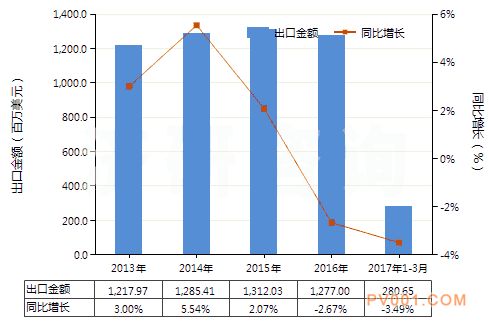 2017年1-3月我国龙头,旋塞及类似装置的零件(用于管道、锅炉、罐、桶或类似品的)出口金额为280.65百万美元,与上年同期相比下降了3.49%。2016年我国龙头,旋塞及类似装置的零件(用于管道、锅炉、罐、桶或类似品的)出口金额为1,277.00百万美元,与上年同期相比下降了2.67%。详见下图: