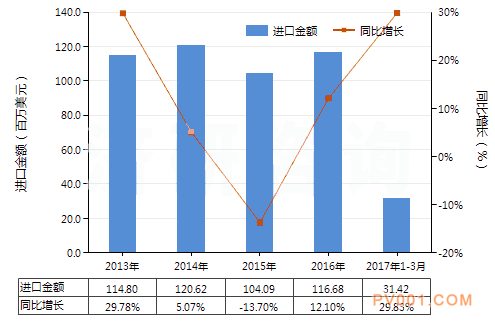 2017年1-3月我国其他回转式齿轮泵进口金额为31.42百万美元,与上年同期相比增长了29.83%。2016年我国其他回转式齿轮泵进口金额为116.68百万美元,与上年同期相比增长了12.10%。详见下图: