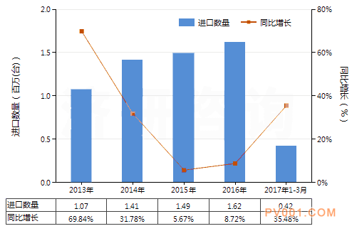 图 2013-2017年3月中国其他回转式齿轮泵(HS84136029)进口量及增速统计