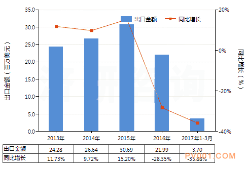 从出口额方面来看,济研咨询数据显示,2017年1-3月我国其他回转式齿轮泵出口金额为3.70百万美元,与上年同期相比下降了35.88%。2016年我国其他回转式齿轮泵出口金额为21.99百万美元,与上年同期相比下降了28.35%。详见下图: