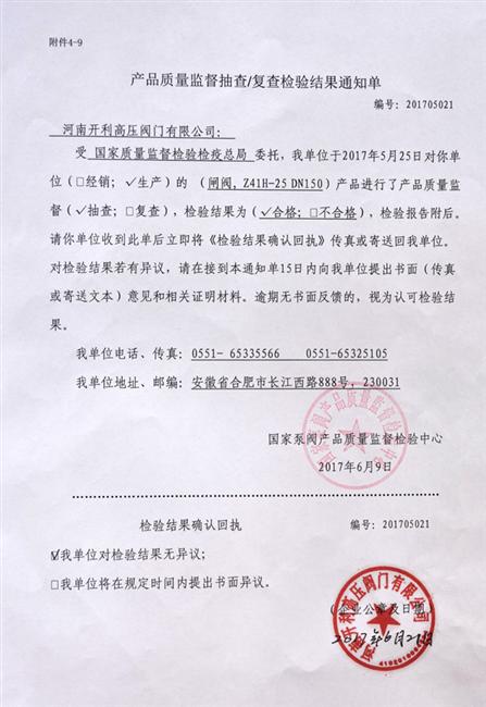 6月9日,国家泵阀产品质量监督检验中心发来通知,对河南开利高压阀门有限公司阀门产品的抽查结果给予肯定。今年5月,国家泵阀产品质量监督检验中心受国家质量监督检验检疫总局委托,对河南开利高压阀门有限公司生产的闸阀产品进行了质量监督抽查,检验结果达到合格标准。