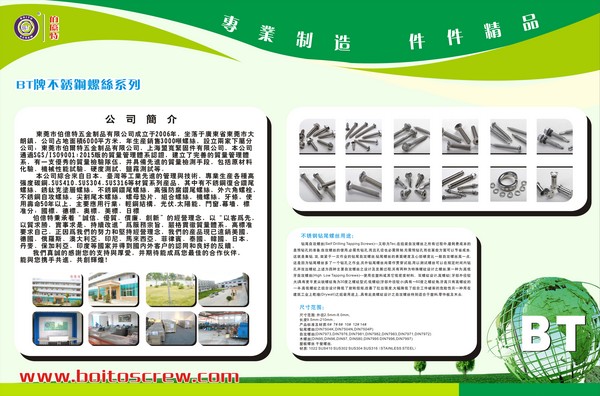东莞市伯億特五金制品有限公司,成立于2006年,坐落于广东省东莞市大朗镇,公司占地面积6000平方米,年生产销售3000吨螺丝,设立两家下属分公司:东莞市伯尔特五金制品有限公司,上海盟宽紧固件有限公司,本公司通过SGS/ISO9001:2015版的质量管理体系认证,建立了完善的质量管理体系,拥有一支优秀的质量检验队伍,并具备先进的质量检测手段,包括原材料化验、机械性能试验、硬度测试、盐雾测试等。