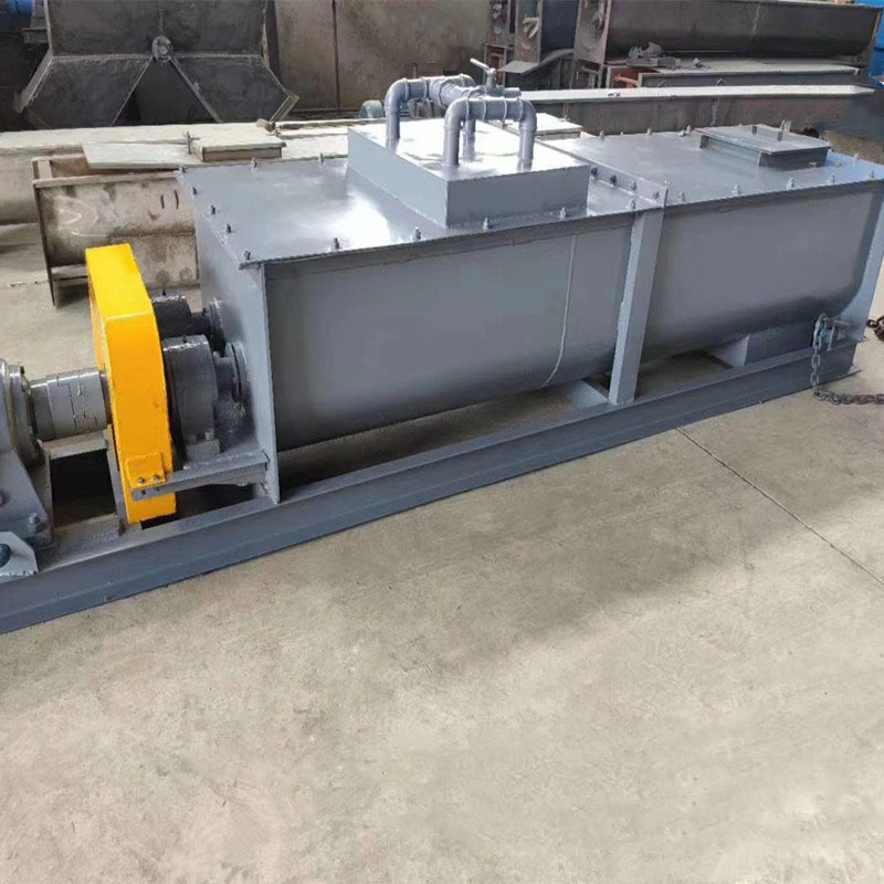 双轴搅拌机主机要求密封严密,无飞灰外扬现象,支承轴采用体外滚柱推力轴承,外壳(厚度不小于12mm)及轴承牢固可靠,主轴材质为45#钢。内壳底部无弧段及其以上200mm内的筒体采用12mm厚的16Mn钢做耐磨衬套,此衬套应安装维护方便,联接牢固。双轴搅拌机轴承要求采用整体轴,不允许采用法兰连接轴承。