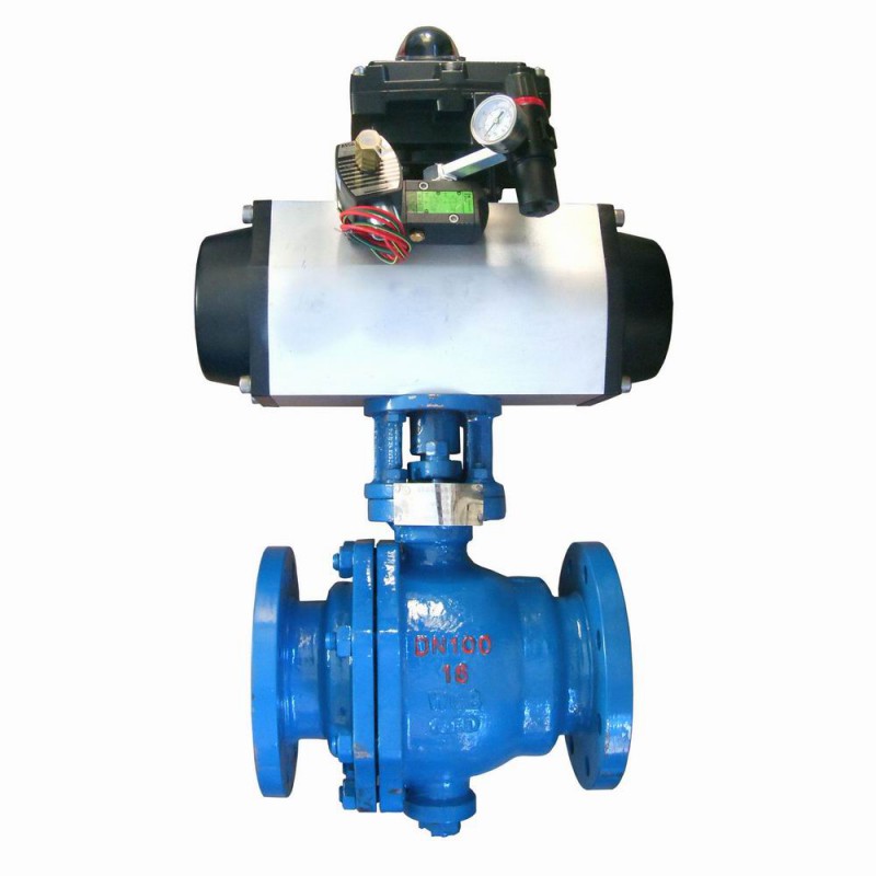 固定球气动球阀的球体是固定的,受压后不产生移动。固定球球阀都带有浮动阀座,受介质压力后,阀座产生移动,使密封圈紧压在球体上,以保证密封。通常在与球体的上、下轴上装有轴承,操作扭距小,适用于高压和大口径的阀门。为了减少气动球阀的操作扭矩和增加密封的可靠程度,近年来又出现了油封球阀,既在密封面间压注特制的润滑油,以形成一层油膜,即增强了密封性,又减少了操作扭矩,更适用高压大口径的球阀。