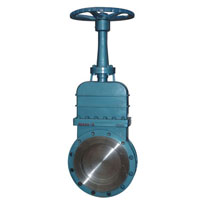 一、手动暗杆式刀形闸阀,属阀门技术领域。所要解决的问题是提供一种结构长度短、体积小、密封可靠、使用寿命长的煤气刀闸阀。构成中包括阀体、闸板、阀盖、阀杆和传动机构,其特点为,阀体为平面板状结构、与管道对夹连接,闸板采用单闸板,一侧与阀体阀座密封,背面与阀体另一侧之间楔形接触,密封面与介质流向相对。所述楔形接触结构是在密封面背面均设楔形压紧块,阀体另一侧对应压紧块处设调节顶丝。本实用新型具有阀体结构长度短、重量轻、阀座密封面可免受介质冲刷,密封面受压均匀、贴合严密、在关闭过程中可将阀座密封面上的尘粒、焦油等刮走以及排污方便等优点。适宜在含粉尘或焦油的煤气管线中使用。
