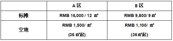 2B区标准展位配置:3面围板、地毯、1张洽谈桌、2张椅子、2只日光灯、中英文楣板、1220伏非照明用电插座。