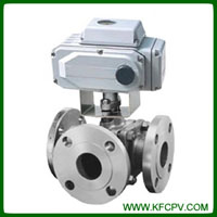 Q945F电动不锈钢T型三通球阀KFF科菲电动三通球阀有T型和L型。T型能使三条正交的管道相互联通和切断第三条通道,起分流、合流作用