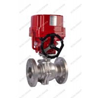 Q941F 型 PN16~PN64 电动球阀:电动驱动、法兰连接形式、浮动球直通式,阀座密封面材料有氟塑料 (Q941F)、硬质合金 (Q941Y),公