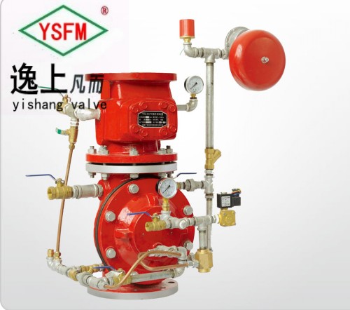 ZSFU预作用报警阀组是由雨淋阀和湿式报警阀上下串接而成,雨淋阀位于供水侧,湿式报警阀位于系统侧而成为预作用阀组。系统由预作用阀、水力警铃、压力开关、空压机、空气维护装置、信号蝶阀等组成,安装闭式洒水喷头,并以常用的探测系统作为报警和启动的装置。其动作原理:一旦发生火灾,安装在保护区感温感烟火灾探测器发出火灾报等信号。火灾报警控制器或消防控制中心,接到报警信号后发出指令打开雨淋阀上电磁阀,使雨淋阀开启,压力水流进系统侧管网,变成湿式喷水系统,同时水力警铃发出报苦,压力开关动作反馈给控制中心显示管路已充水,并启动消防泵。此时管道上安装闭式洒水喷头尚未释放,不会喷水。人尚可主动地经主管人员采取适当行动将火扑灭,避免喷头动作水渍造成的损失。如果火灾控制不住继续发展,致使闭式喷头玻璃球动作喷水,水泵自动启动。