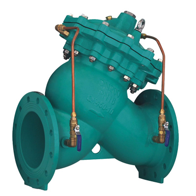 JD745X多功能水泵控制阀斜体式水泵控制阀也是一种自动类阀门,它的动作原理、结构与隔膜式水力控制阀基本一致。它具有隔膜式同样的优点和功能,它的感应部件同样是膜片,主要不同之处是主阀体采用斜体式,这样使该类阀门比隔膜式和活塞式的流阻系数更小,流量更大。而且通过对膜片下腔的结构及阀瓣结构的改进,使该阀的调节性更好。