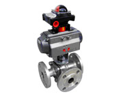 气动三通球阀分L型和T型,介质流通方向见下图。L型气动三通球阀适用于介质流向的切换,能使相互垂直的两个通道连通:T型气动三通球阀适用于介质的分流、合流或流向 切换,T型孔道可以使三个通道互相连通或使其中两个通道连通,气动三通球阀一般采用两个阀座结构,亦可根据用户要求采用四阀座结构。