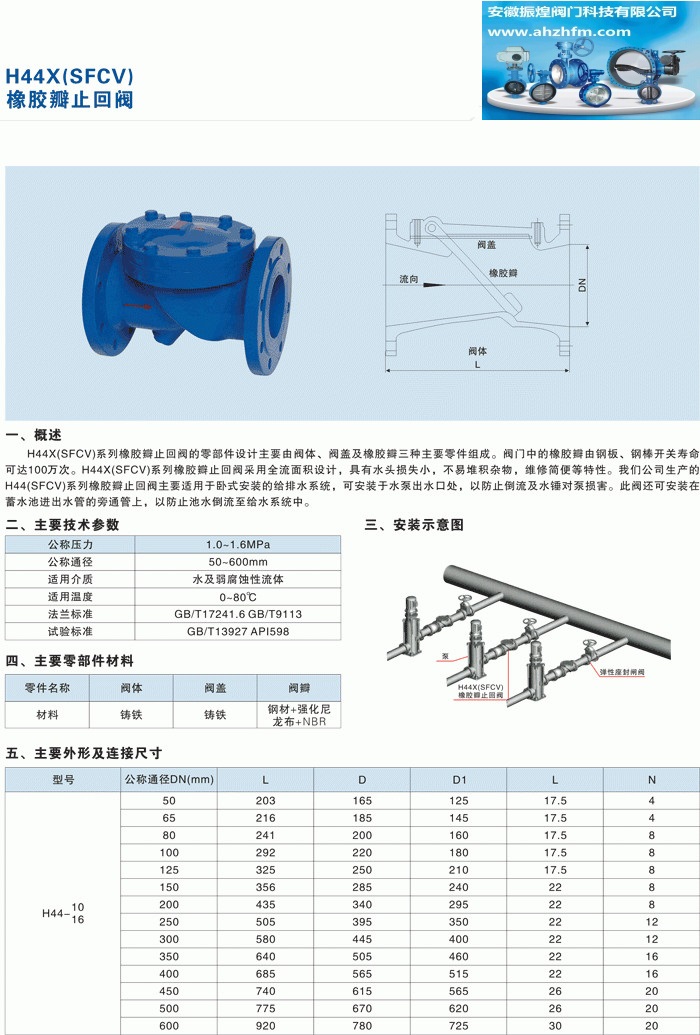 H44X(SFCV)系列橡胶瓣止回阀的零部件设计主要由阀体、阀盖及橡胶瓣三种主要零件组成。阀门中的橡胶瓣由钢板、钢棒开关寿命可达100万次。H44X(SFCV)系列橡胶瓣止回阀采用全流面积设计,具有水头损失小,不易堆积杂物,维修简便等特性。我们公司生产的H44X(SFCV)系列橡胶瓣止回阀主要适用于卧式安装的给排水系统,可安装于水泵出水口处,以防止倒流及水锤对水泵损害。此阀还可安装在蓄水池进出水管的旁通管上,以防止池水倒流至给水系统中。