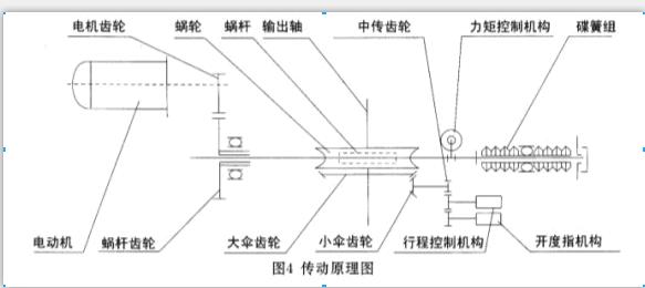 主要由电动机、减速机构、力矩控制机构、行程控制机构、开度指示机构、手-电动切换机构、手轮及电气部分组成。其传动原理如图所示。