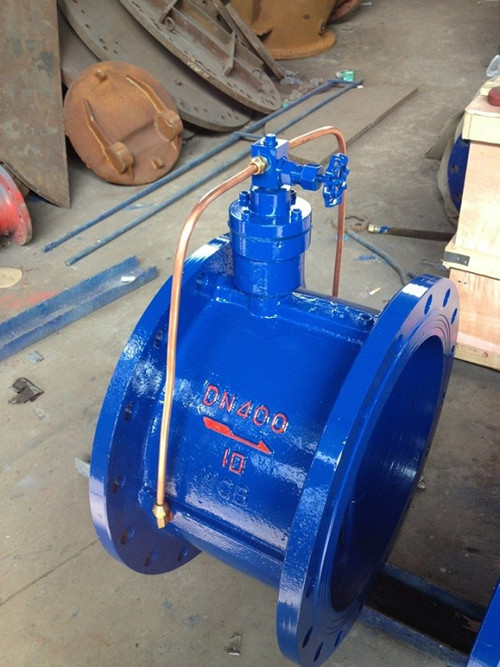 微阻缓闭蝶式止回阀主要由阀体、两块半圆阀瓣、回位弹簧、储油缸、缓闭小气缸组、针型阀(微量调节阀)组成。其原理主要依靠进口介质的推力作用,将两块阀瓣平稳推开。在此同时,进口的压力介质进入油缸内活塞的下部,推动活塞,将活塞上部的油通过针型阀分别压入阀体两侧的小气缸尾端,使小气缸内的活塞杆伸出。当进口介质压力下降低于出口压力时,介质将产生回流,此时阀瓣在弹簧和介质回流的作用下,将自动关闭。但由于活塞杆处于伸出的位置,顶住阀瓣不能全部关闭,还剩有20%左右的面积使介质通过,从而起到了消除水锤的作用。阀瓣被活塞分成先快速关闭后缓慢两步关闭,达到既防电机逆转又起消除静音作用。