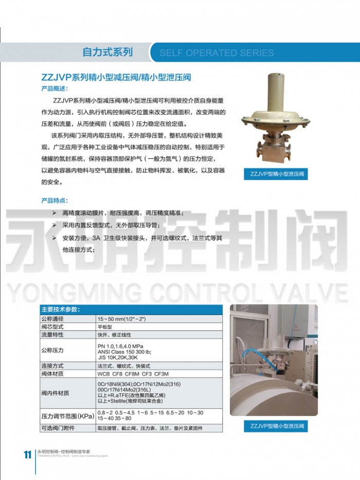 ZZV型 自力式微压调节阀无需外加能源,利用被控介质自身能量作为动力源,引入执行机构控制阀芯位置来改变截流面积,从而改变两端的压差和流量,达到控制阀后压力 稳定(阀后型)或泄压(阀前型)的目的。具有动作灵敏,密封性好,压力波动小等优点,广泛应用于各种工业设备中气体的微压力控制及各种非腐蚀性气体的减压 稳压或泄压稳压场合;