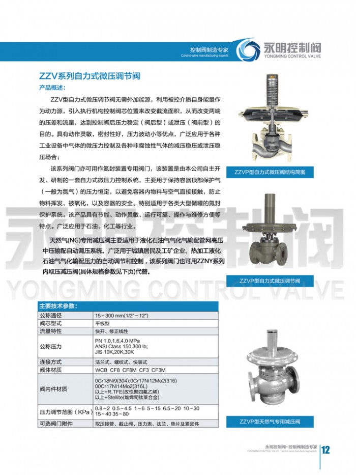 该系列阀门采用内取压结构,无外部导压管,整机结构设计精致美观,广泛应用于各种工业设备中气体减压稳压的自动控制,特别适用于储罐的氮封系统,保持容器顶部保护气(一般为氮气)的压力恒定,以避免容器内物料与空气直接接触,防止物料挥发、被氧化,以及容器的安全。