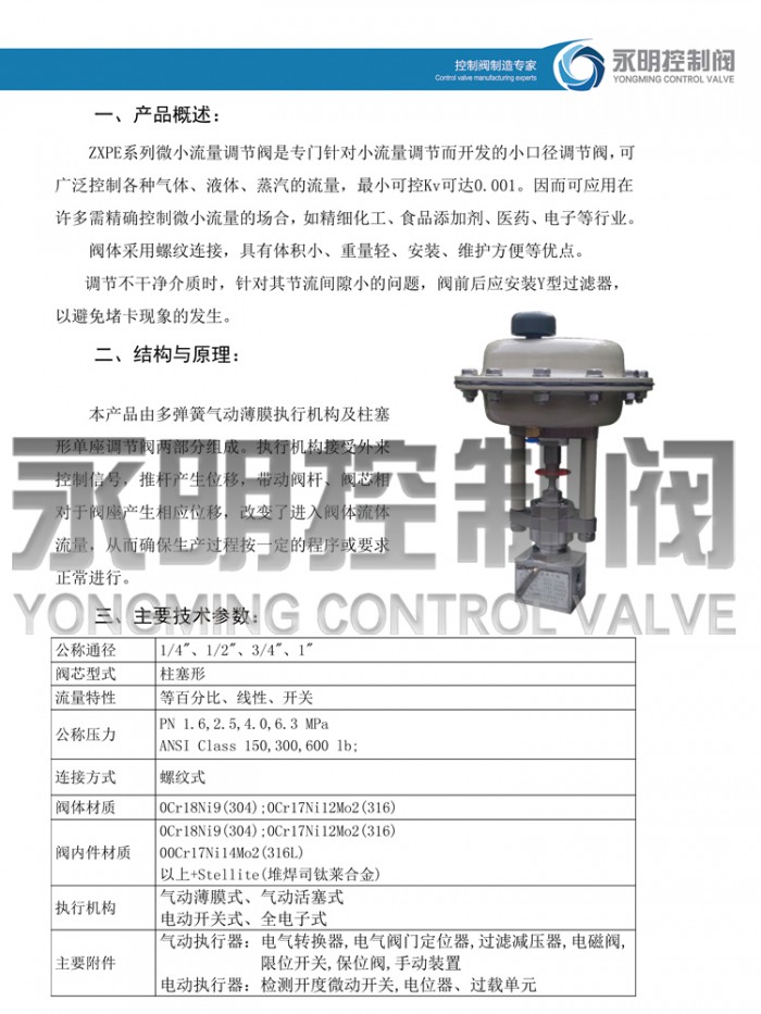 ZXPE系列微小流量调节阀是专门针对小流量调节而开发的小口径调节阀,可广泛控制各种气体、液体、蒸汽的流量,*小可控Kv可达0.001。因而可应用在许多需精确控制微小流量的场合,如精细化工、食品添加剂、医药、电子等行业。