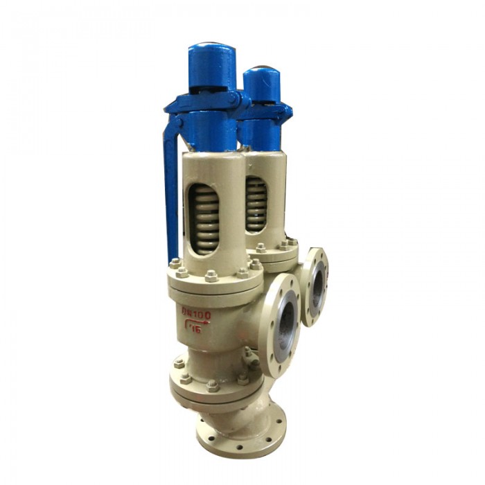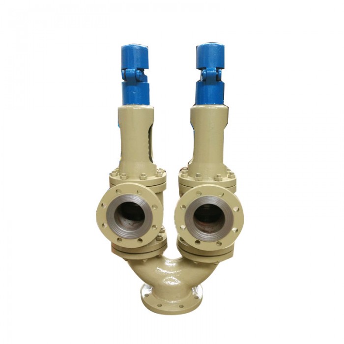 弹簧式双联安全阀适用于工作温度≤350℃的蒸汽、水等介质的设备和管路上。作为超压保护装置。连接法兰标准按JB/T......94的系列1A38Y、A43H、A37H型双联安全阀是在Y型接头上装设两个同样规格的A48Y或A47H型安全阀而构成。