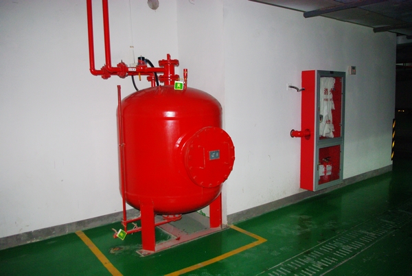 当压力水流经比例混合器时一部分压力水(3%-6%)由支管进入泡沫液储罐内挤压胶囊,置换出等量的泡沫液与另一部分水(97%-94%)在比例混合器内混合成泡沫混合液提供给泡沫产生装置,产生空气泡沫进行灭火。